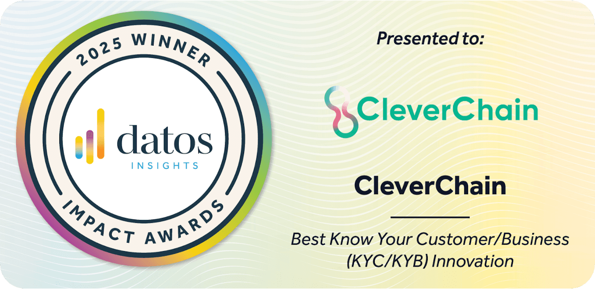 We are proud to announce that CleverChain has been recognised by Datos Insights with the 2025 Impact Award for Best Know Your Customer/Business (KYC/KYB) Solution.